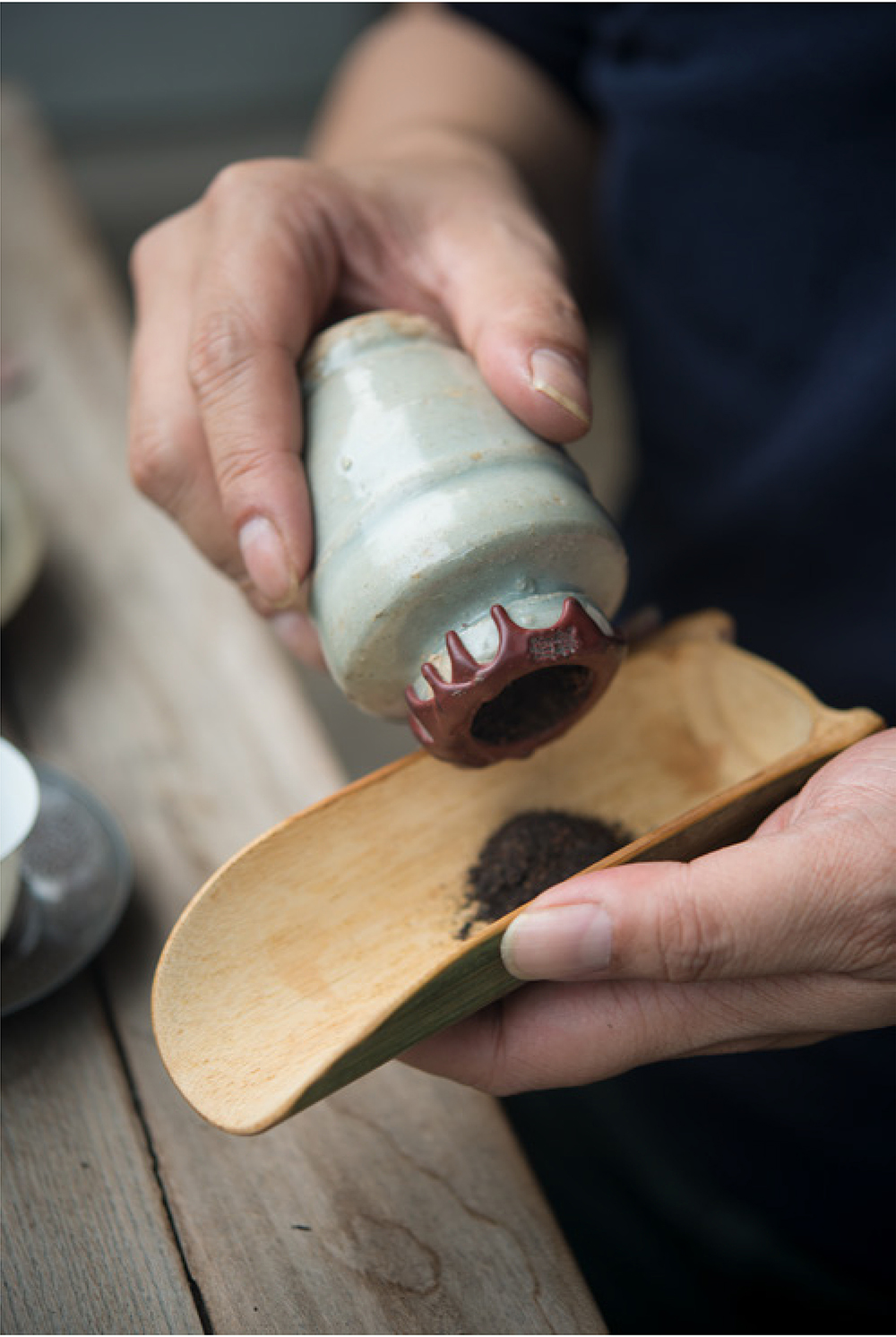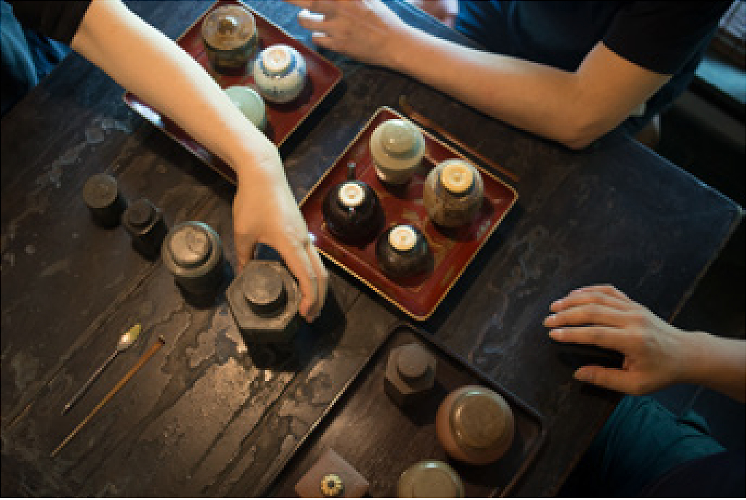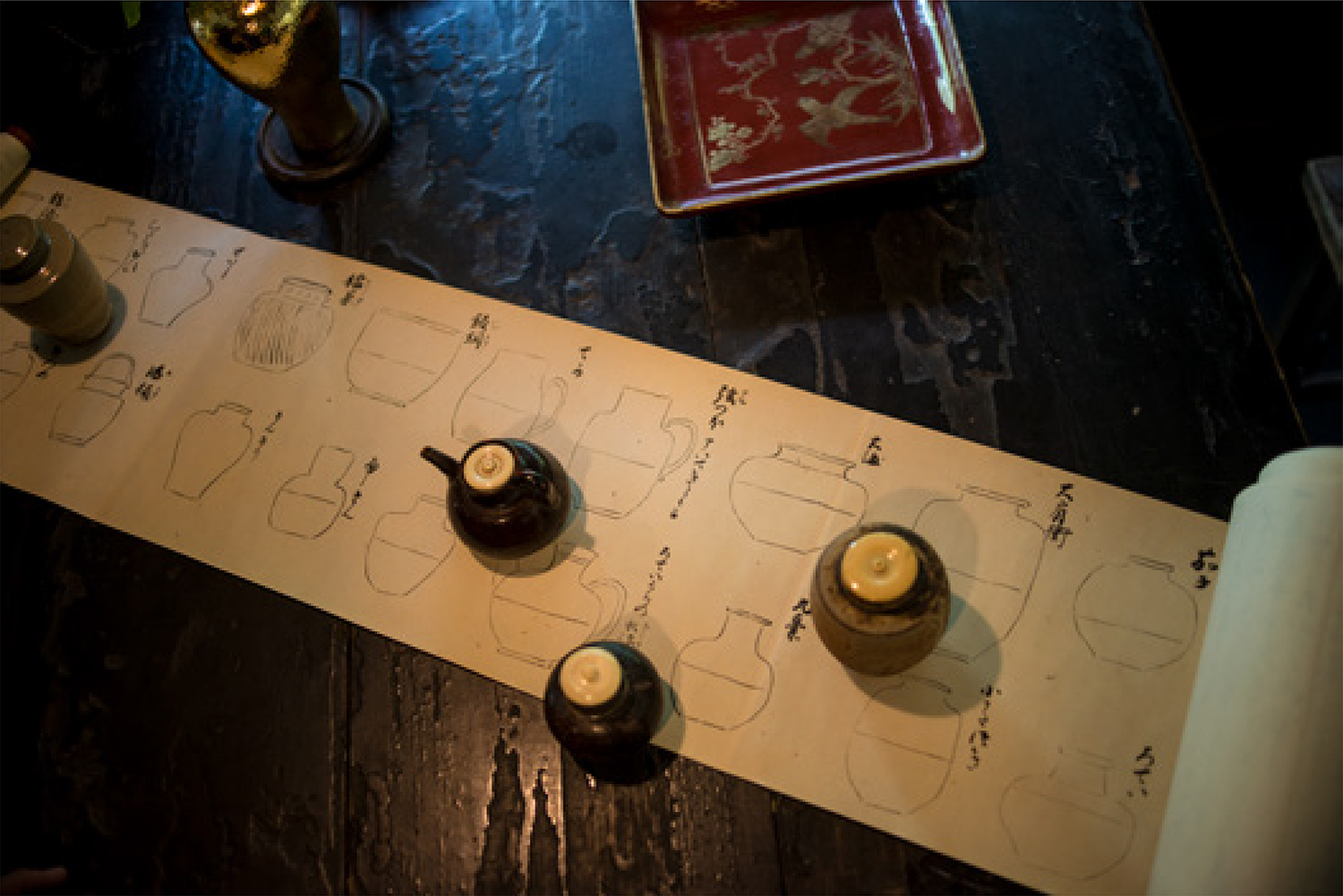 吴杰熙先生取出台湾老绿茶相与啜品,宗淳先生将其平时赏玩的茶罐展陈案上,与诸君探讨洪唐窑与唐物茶入的流变。在座之人不逐价值之高低,而是平心而观,摩挲追赏,在清茗的寒香之中见古器出尘,在格物雅怀
