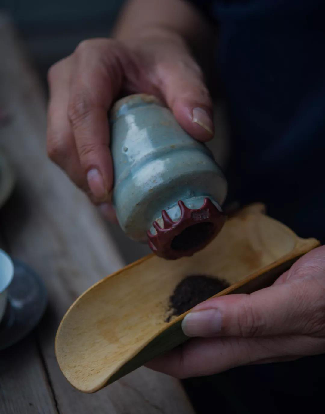 他從《茶經》中獲得靈感:「如魚目微有聲為一沸;緣邊如湧泉連珠為二沸;騰波鼓浪為三沸」。經過虹吸的三沸煮出來的茶,顏色竟跟咖啡一樣,很深很深,入口即滑,有歲月的凝重,卻無塵世的火氣。