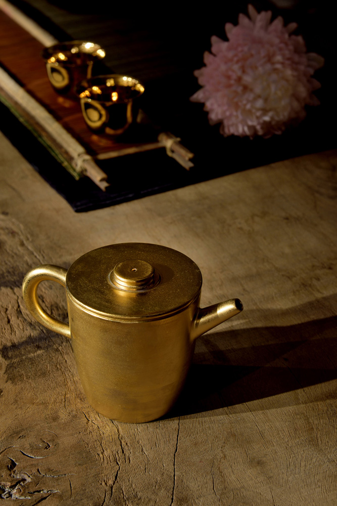 吳 「 當時法門寺出土「套唐代金器,受到啟發,那樣可以讓水質更好。純金製作的茶具,裝茶會有過燙的問題,市面上眾多使用的本金則含鉛量超標,對人體有影響,於是我們不惜重金,均選用德國高純度納米純金釉。