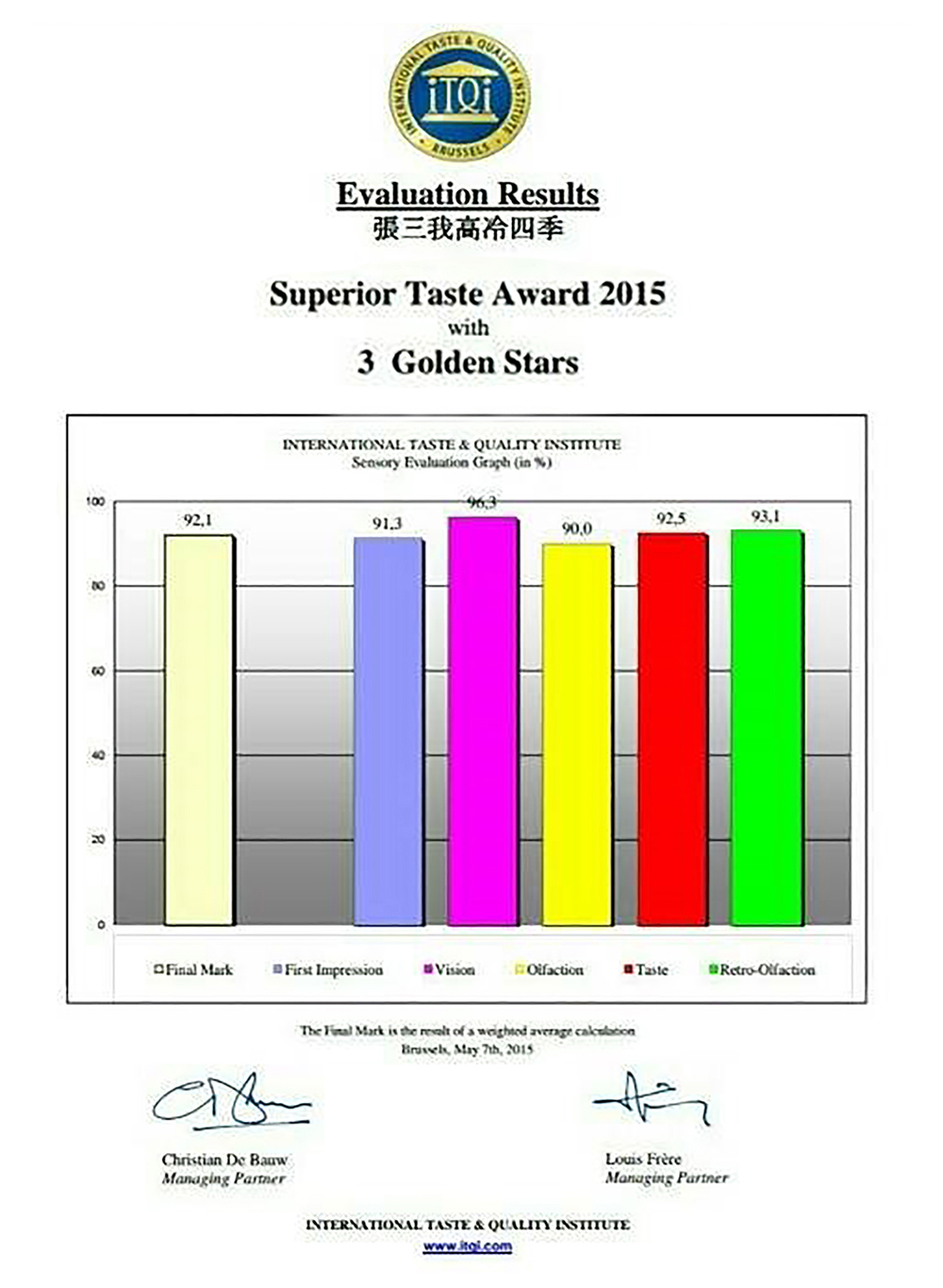 - 得到總分數90%以上的分數者(假設滿分為100,得到90分以上者),獲頒Superior Taste Award(風味絕佳獎章)三星美味;