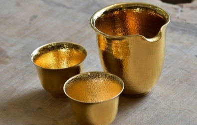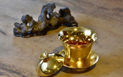 黃金,自古即是大家愛不釋手金屬,更是財富的象徵,純金釉的薄胎瓷杯喝老綠茶,可助湯潤,更襯茶湯美 。