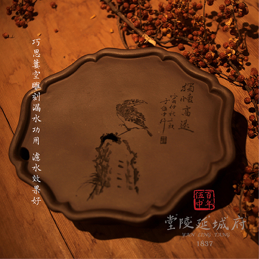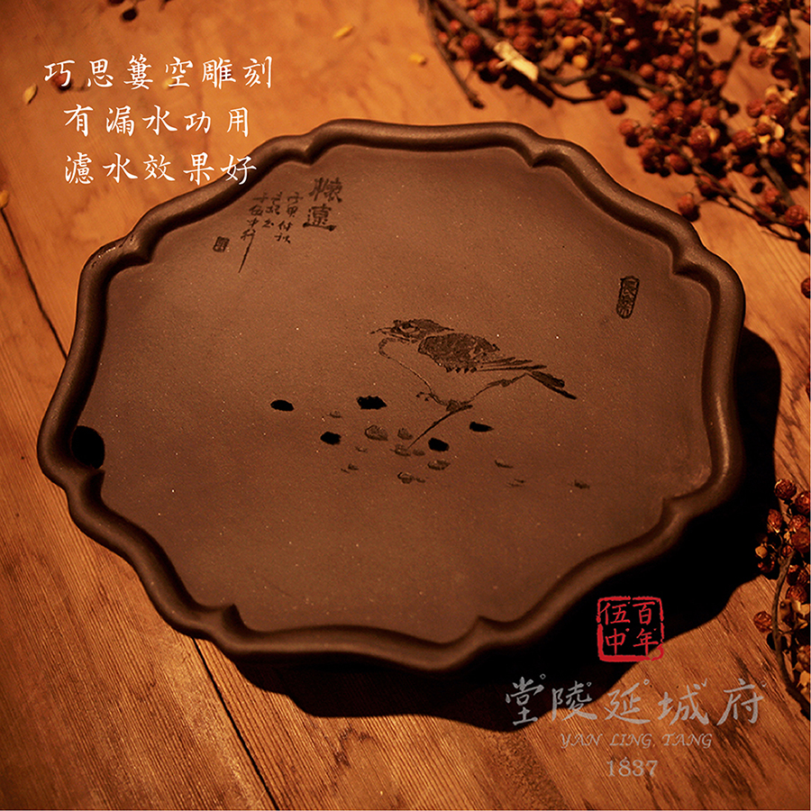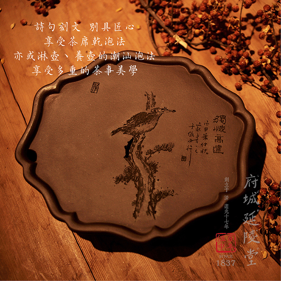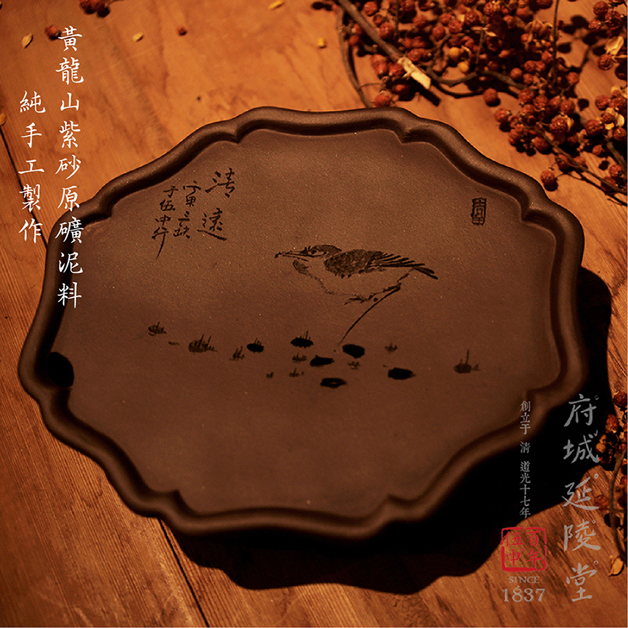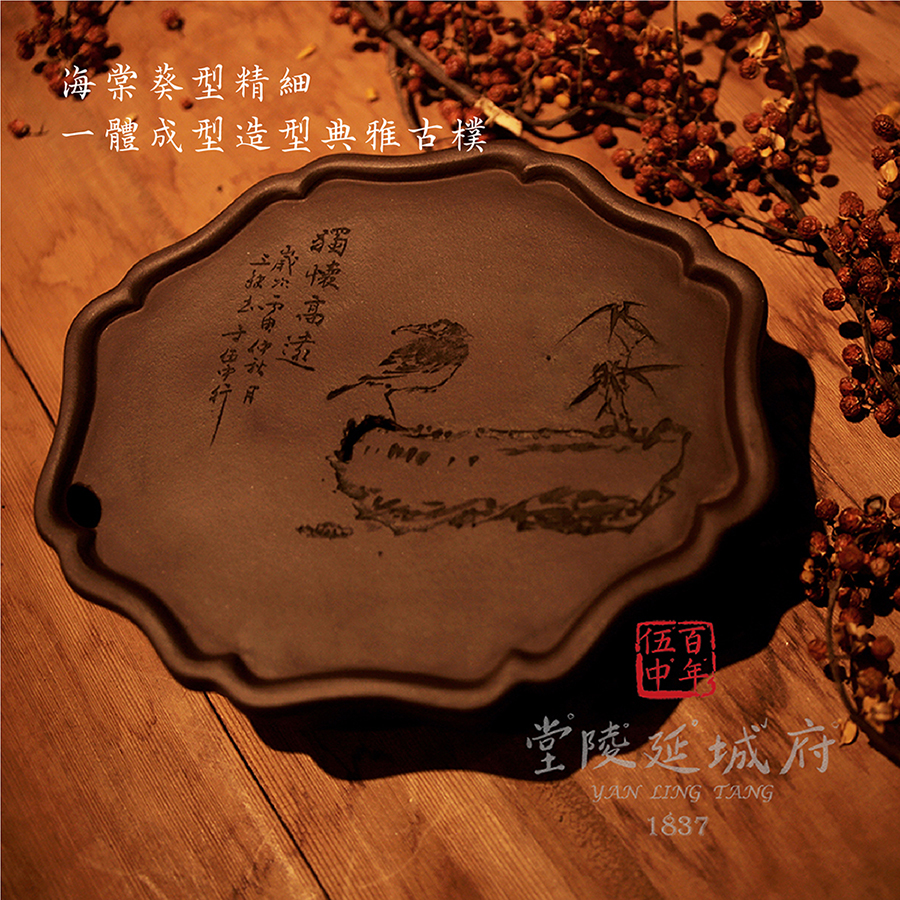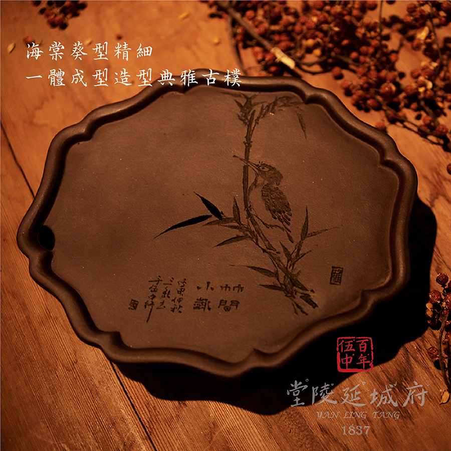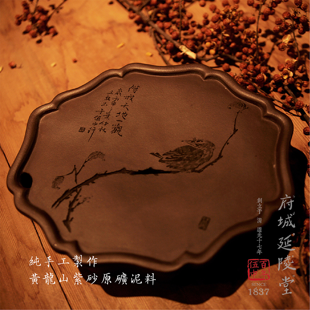 - 品名: 手工海棠葵型原礦紫砂壺承 - 鳥款