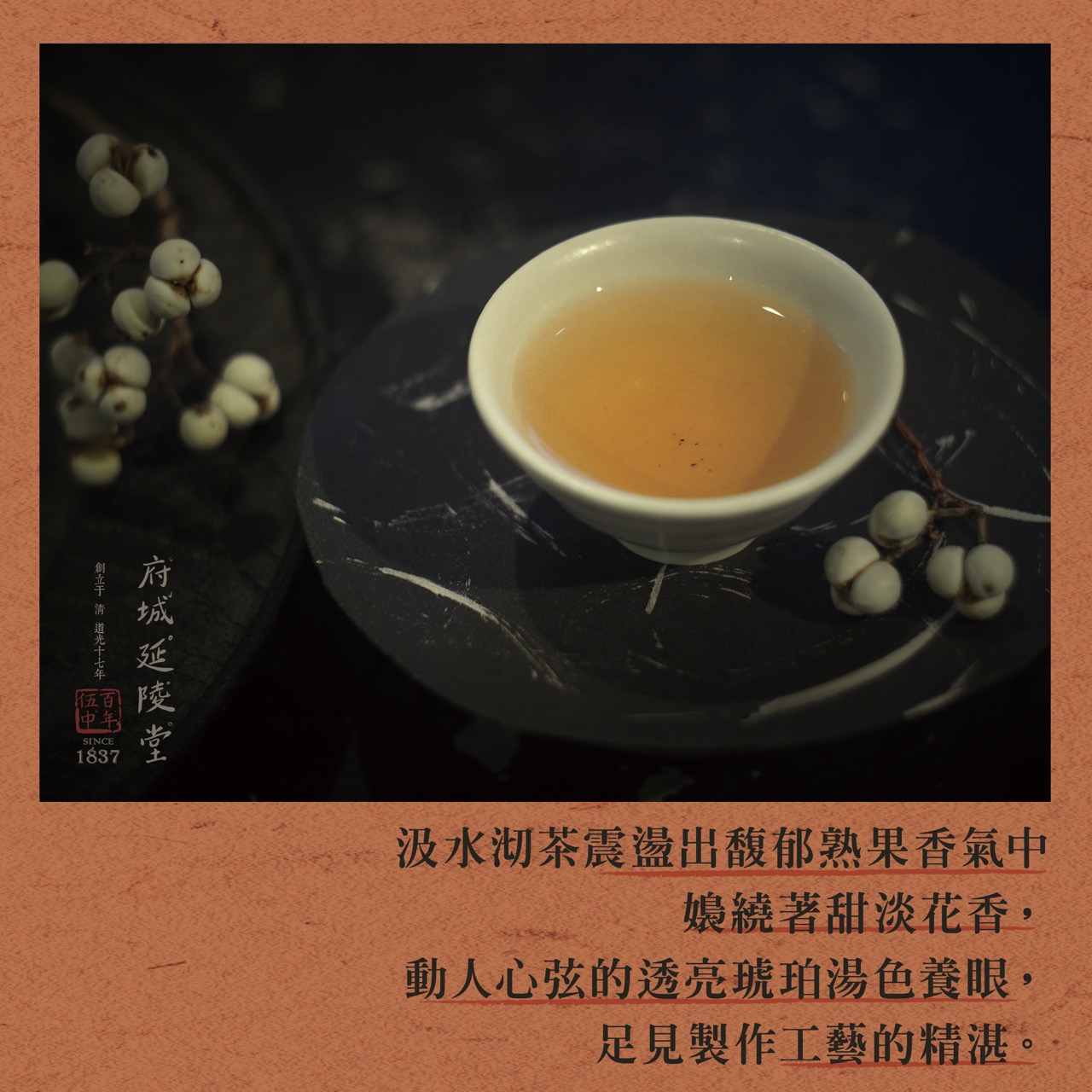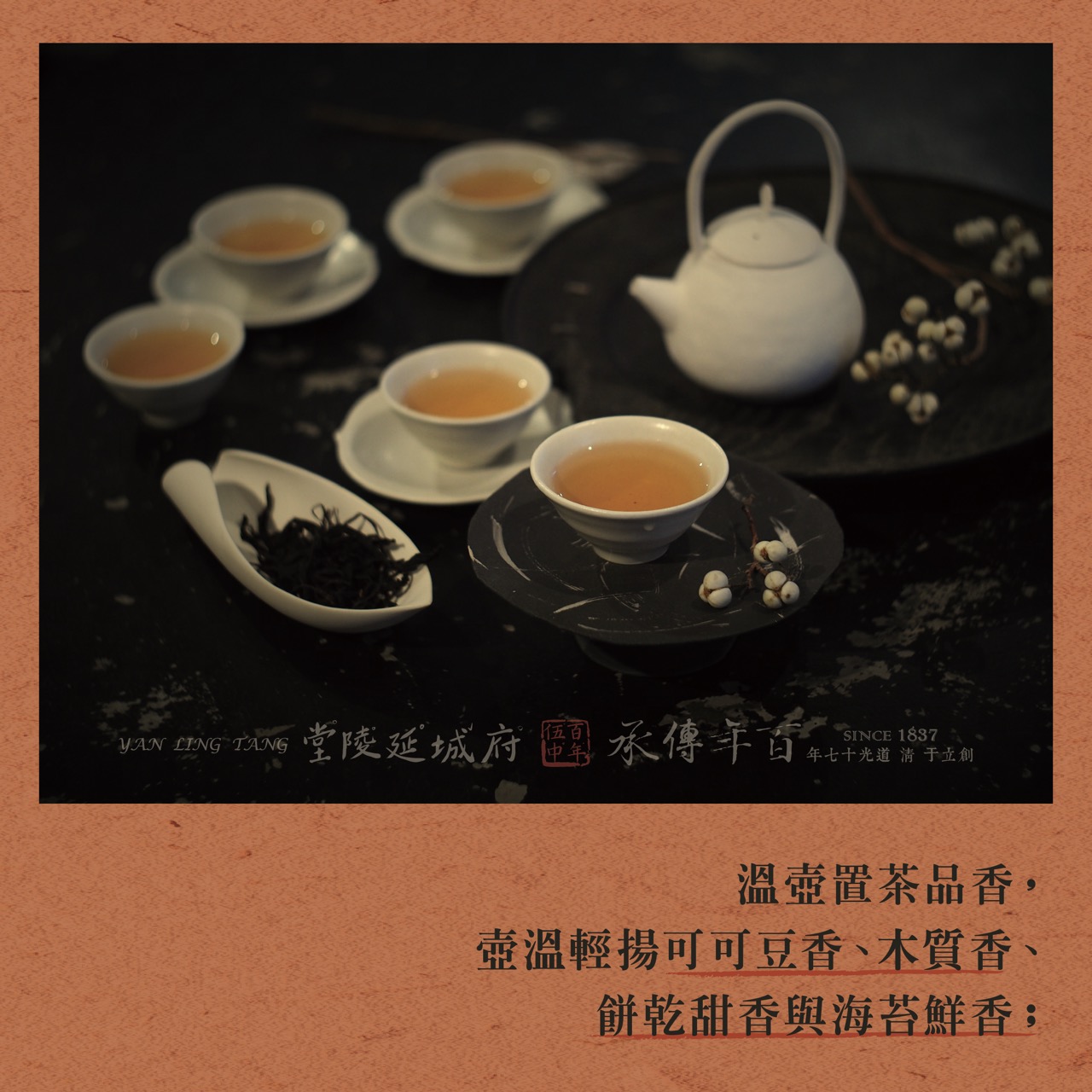 溫壺置茶品香,壺溫輕揚可可豆香、木質香、餅乾甜香與海苔鮮香;汲水沏茶震盪出馥鬱熟果香氣中嬝繞著甜淡花香,動人心弦的透亮琥珀湯色養眼 ,足見製作工藝的精湛。