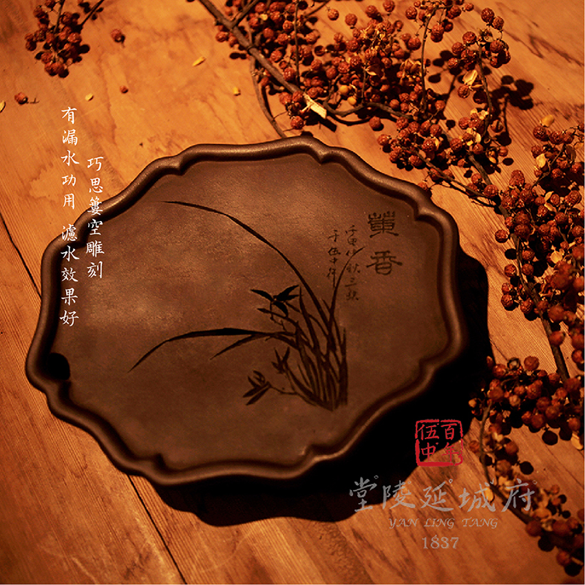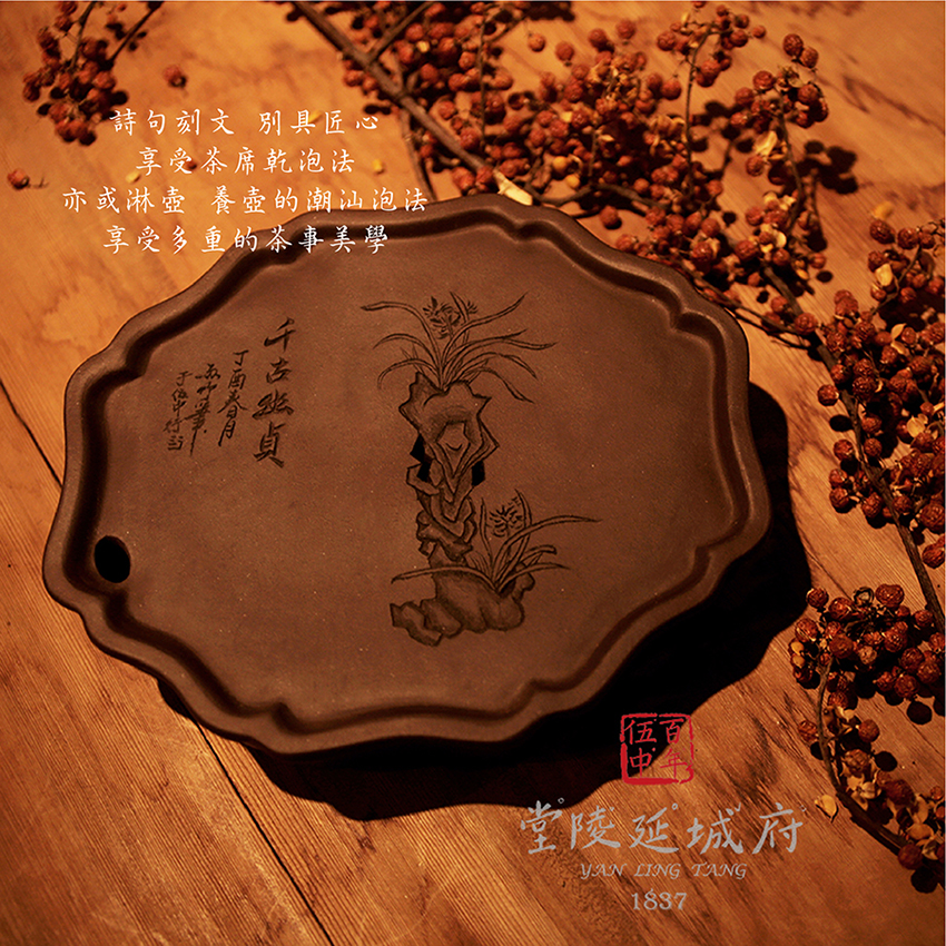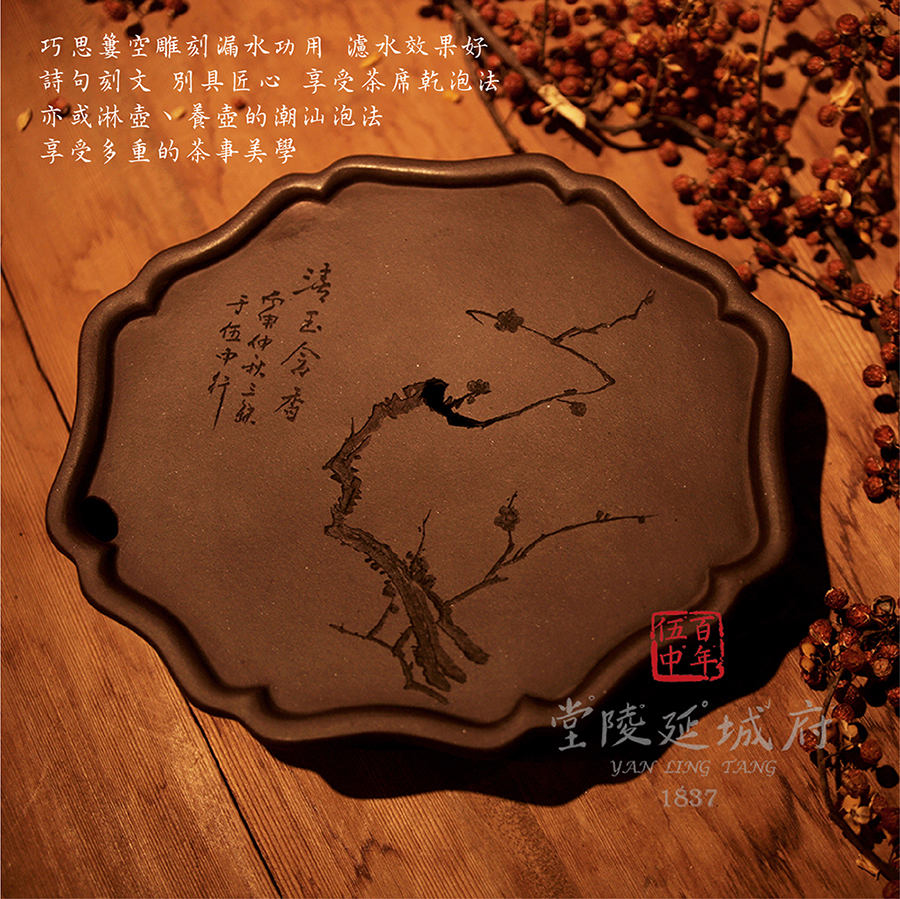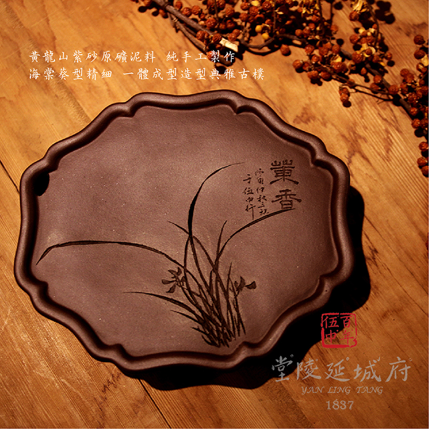 - 品名: 手工海棠葵型原礦紫砂壺承 - 花款